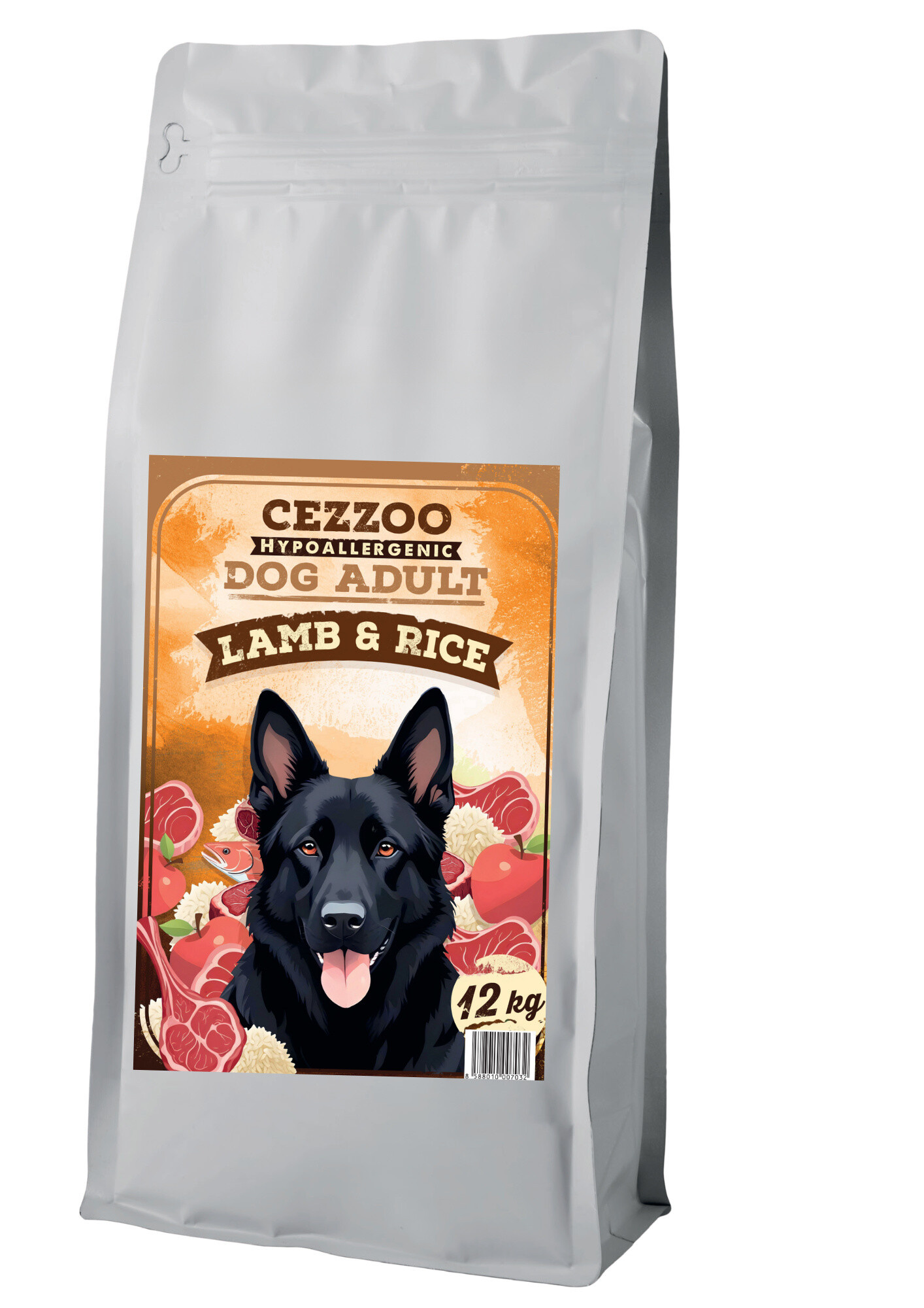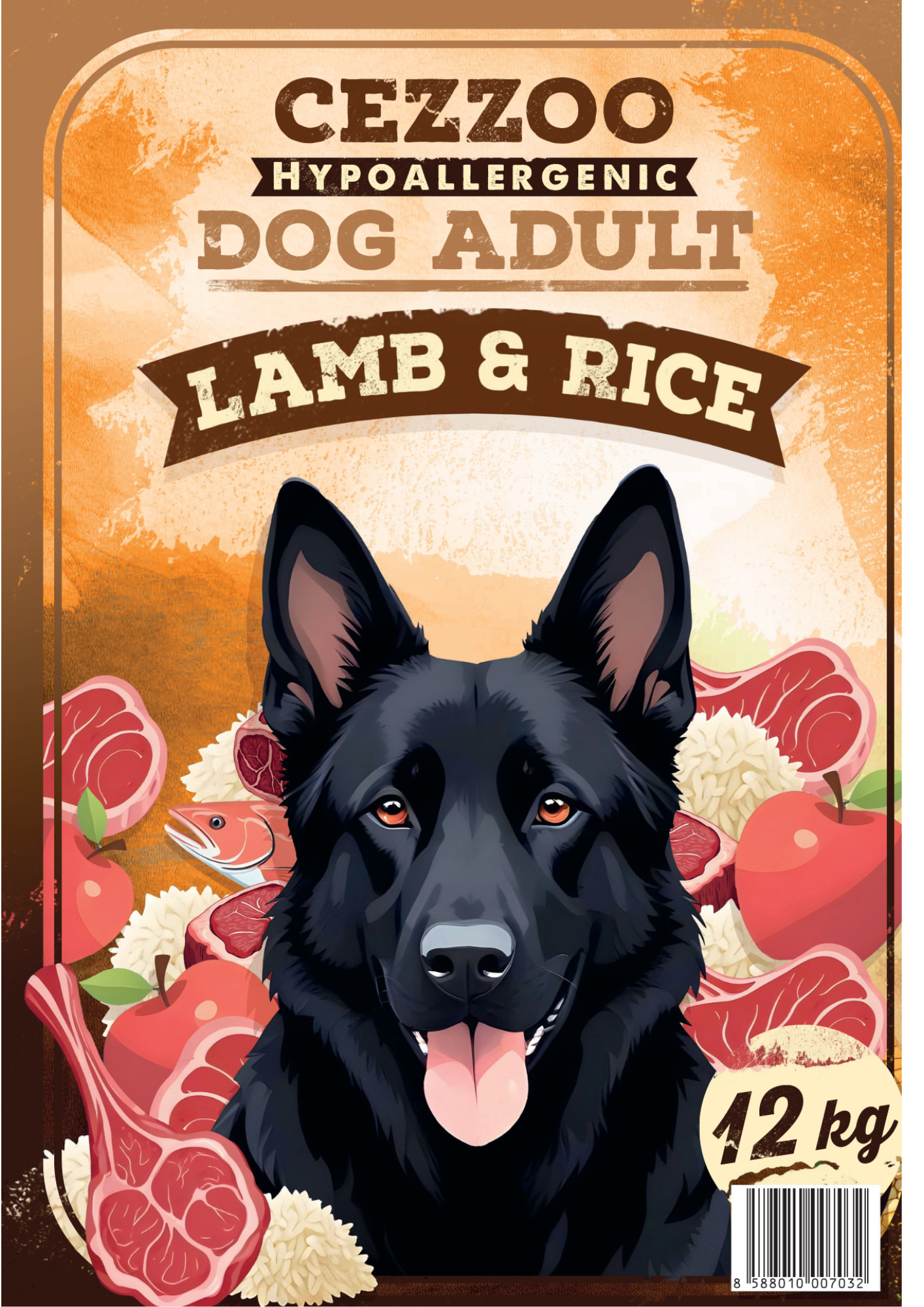 kvalitné jahňacie dehydrované mäso 28 %, lúpaná ryža 27 %, ryžová múka 15%, hovädzie škvarky 8%, bravčový tuk 5,5 %, cukrovarské rezky sušené, pivovarské kvasnice 1 %, jablká sušené, lososový olej 0,5 %, čakankový inulín 0,1 %, glukozamín, chondroitín-sulfát, juka 0,02 %